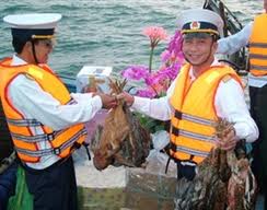 After readjusting the schedule several times due to rough sea, a delegation of C-region Naval Command managed to arrive on Con Co island. Tet gifts for people and soldiers stationed there include green square sticky rice cakes, pork, sweetened fruits, confectionaries and even blossoming yellow apricot flowers.