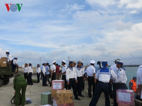 Despite seasickness, smiles graced the faces of the working team of Navy Zone 4 High Command and the more than 100 journalists who arrived at Da Lat (Ladd Reef) in the Truong Sa island district of Khanh Hoa province. To them, the moment of setting foot on the island was sacred and miraculous. Guests and hosts hugged and shook hands as if they were old friends. Stories were told and songs were sung, reminding people of the approaching Tet and expressing their lovefor the homeland. Singer Kim Thuy told VOV: “I have dreamed of visiting Truong Sa. Today, my dream came true and I feel very happy and honored. I want to dedicate to the Truong Sa soldiers a song called “My heart and a soldier’s heart.”