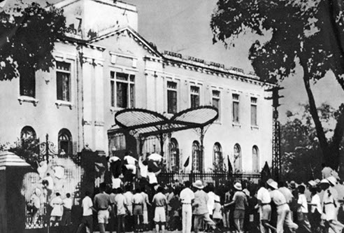 | Demonstrators gathered in front of the Government’s Guest House in Hanoi on August 19, 1945 (Photo: Archive) |