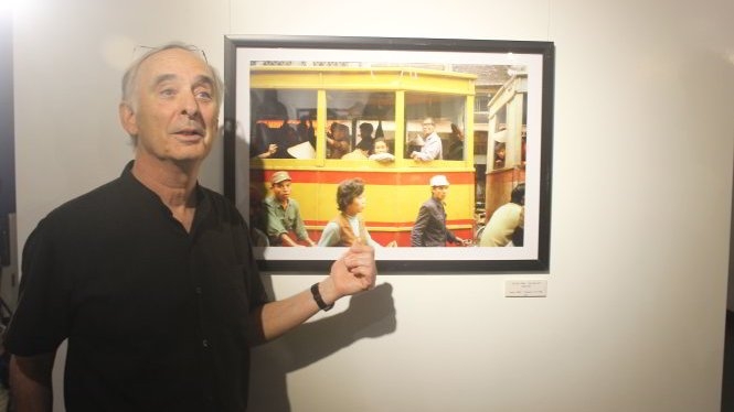 | Journalist Michel Blanchard is introducing his photo on an electrical tram on Hang Dao Street in 1984. (Photo: vietnamnet.vn) |