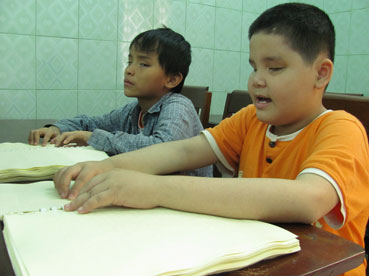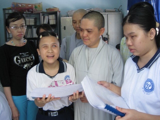 The Bung Sang (Glow) Blind Center is in an alley off Nguyen Tri Phuong Street, District 10. It has been established for 29 years to teach and care for the blind. About 30 blind students have been sponsored by the center, most of them from difficult backgrounds. Every morning, the center’s Sisters lead children to Nguyen Dinh Chieu School, a special school for the handicapped, and pick up them in the afternoon for after-class help and to feed them. When the children go to school, the Sisters plait beads together and make fine arts and sell them to earn more money to help provide meals for the children. Although not blind themselves, the Sisters all want to learn Braille to be closer to their children. Sister Nguyen Thi Hoang is the head of the center: “By learning Braille, we better understand what they need and become closer to them. When accompanied by us, the children’s study seems to become easier”.