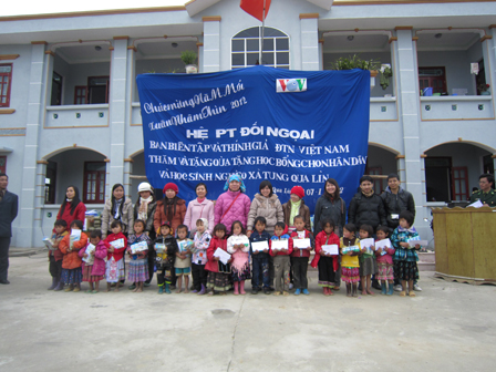 After 15 hours spent traveling 500-kilometers, the vehicle arrived in Tung Qua Lin commune full of Tet gifts and VoV reporters. Welcoming the delegation were teachers of the commune’s Primary School and soldiers of Giao San Border Station 281. Their warm hospitality seemed to revive the tired delegation. Nguyen Duc Anh, a young reporter from the Chinese Section of the Overseas Service shares his first impression of this remote border area ‘I realized the living conditions of local people are very hard, especially the poor children. They don’t even have clothes to wear. It’s very cold here but their houses are in such bad condition that the wind blows in from everywhere. I feel pity for the locals. The trip has made a big impression on me’.