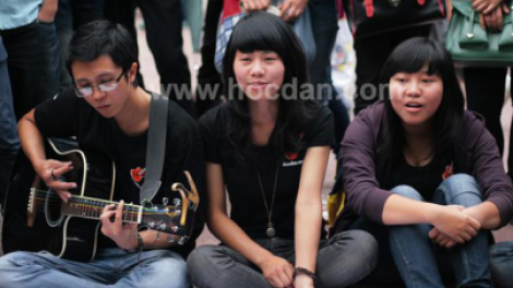 (VOVworld) – Without a stage, colorful lights, an amplifier system, or loudspeakers, and even without chairs for the audience, performances by the ‘Buskers’ group’ always attract the attention of pedestrians passing by the Le Thai To Statue in Hanoi. The audience makes a big circle around the group of young people, who beat the Cajon drum, play the guitar, and one sings. All mix together to create a typical chorus.