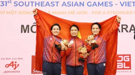 (VOVWORLD) - On Friday, the third day and also the last day of karate competition of the 31st Southeast Asian Games at the Ninh Binh Provincial Gymnasium, Vietnamese athletes Ho Thi Thu Hien, Hoang Thi My Tam, Nguyen Ngoc Ngoan and Trang Cam Lanh excellently brought home the gold medals in the women's team kumite event.