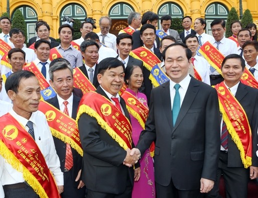 | President Tran Dai Quang meets representatives of outstanding cooperatives and cooperative groups, along with individual farmers with inventions in agricultural production in Hanoi on November 13, 2016. (Photo: Nhan Sang/ VNA) |