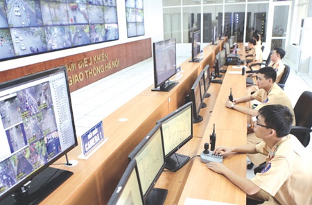 | Traffic police operate at the Hanoi Centre for Traffic Signal Control, a new project on IT advancement. (Photo: VNA/Huy Hung) |