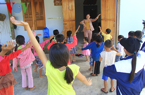 Ms. Ly is instructing the children to practice singing and dancing. (Photo: Khoa Diem)
