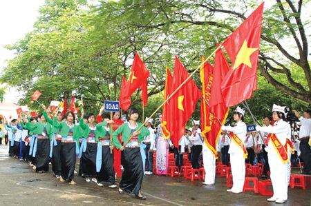 | Students of the Ba Vi Boarding School for Ethnic Groups mark the opening of their new school year with flags and banners. (Photo: VNA/VNS/ Quoc Khanh) |