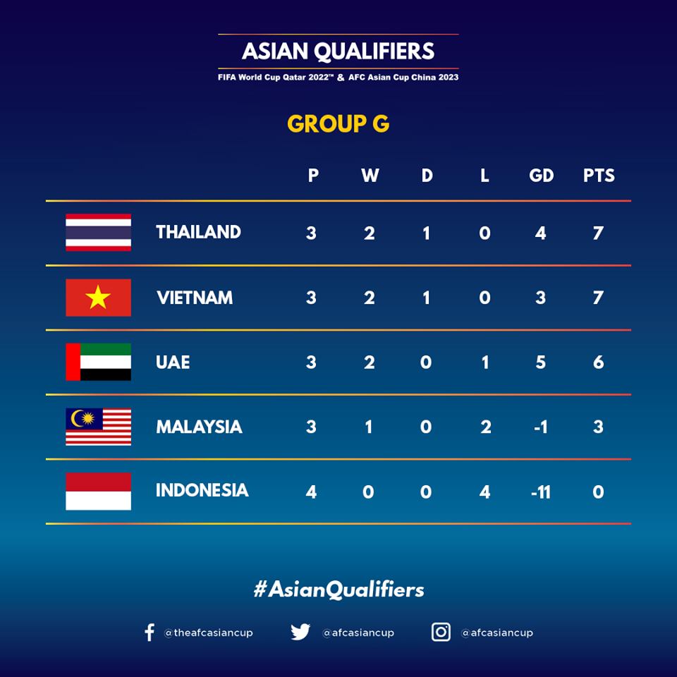 After three games, Thailand leads Group G with seven points and are ahead of Vietnam on goal difference.