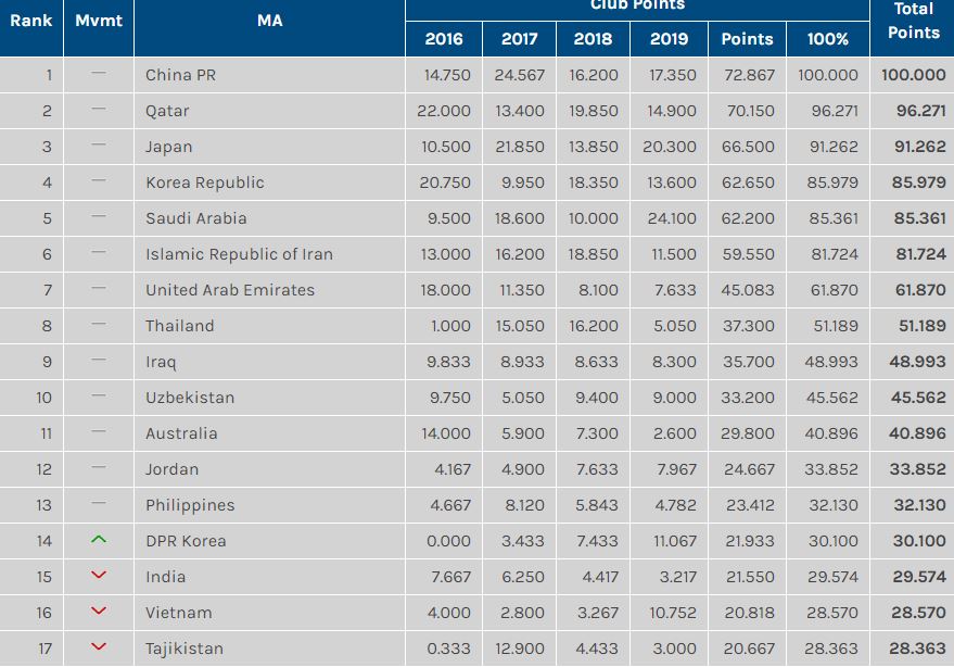 Malaysia and Thailand were in East Asia’s top 6 in the 2017 rankings and therefore qualified for the AFC Champions League 2020 (ACL).