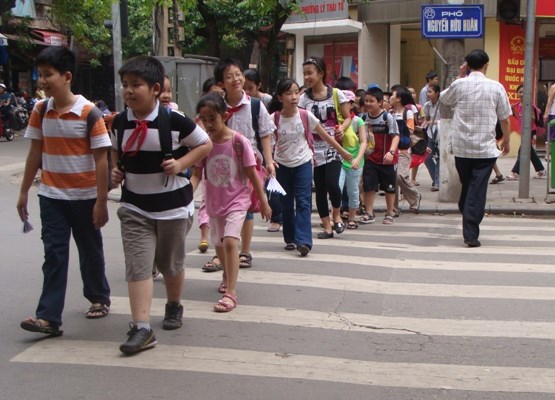 | Children cross Nguyen Huu Huan street in Hanoi (Photo: dangcongsan.vn) |