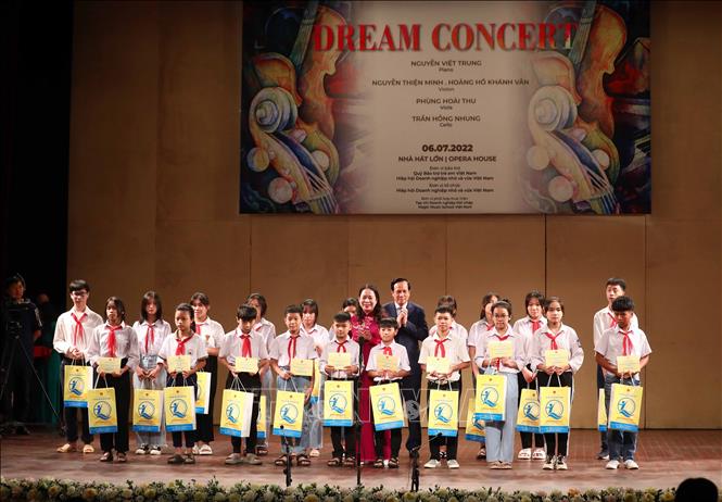 At the “Dream Concert”, Vice President Vo Thi Anh Xuan, who is Chairwoman of the National Fund for Vietnamese Children Sponsorship Council, and Minister of Labour, Invalids and Social Affairs Dao Ngoc Dung presented scholarships worth 86 USD each to 20 disadvantaged children in Hanoi’s outlying district of Thach That.