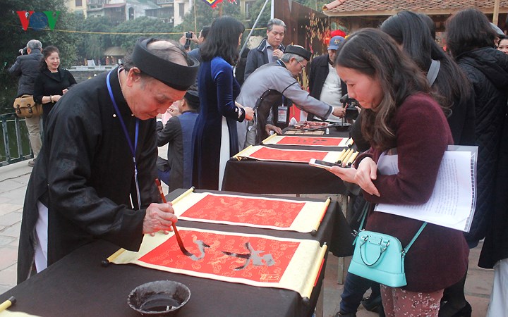 60 calligraphers write either Chinese or Vietnamese scripts on poonah paper with a hope of good luck, good health, and prosperity for those in attendance. There is an exhibition of 35 calligraphic works and other traditional craft activities including pottery, paper making, embroidery, wood carving, and bronze casting.