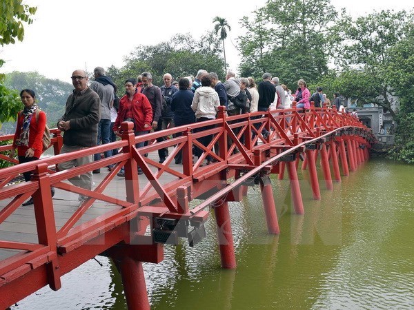 Foreign tourists walk across The Huc Bridge in downtown Hanoi. (Photo: VNA) |