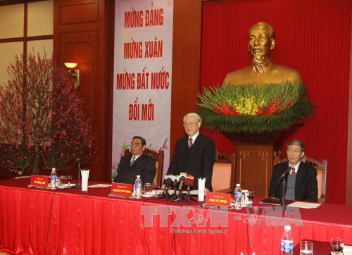| Party leader Nguyen Phu Trong holds a Tet meeting with intellectuals, scientists, and artists at CPV's headquarters in Hanoi on Thursday (photo: Tri Dung/ VNA) |