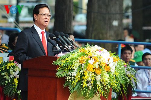 (VOVworld) – A meeting and parade was held in HCM city on Thursday to mark the 40th anniversary of the liberation of southern Vietnam and national reunification April 30. The meeting was attended by Party leader Nguyen Phu Trong, President Truong Tan Sang, Prime Minister Nguyen Tan Dung, National Assembly Chairman Nguyen Sinh Hung, former Party and state leaders, and representatives of war veterans, heroic Vietnamese mothers, and international delegations from Laos, Cambodia, and Cuba.