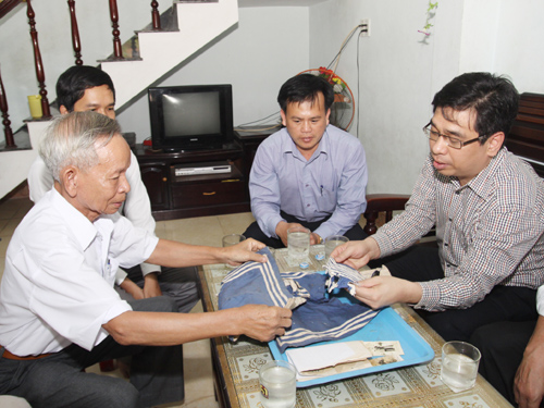 | Lê Văn Xuân (left, 63 years old from Hòa Cường Nam Ward in Hải Châu District of Da Nang city), father of martyr Lê Văn Xanh, talks about the torn naval uniform, the left keepsake of martyr Xanh (Photo by Nguyễn Tú of Thanh Nien Newspaper) |