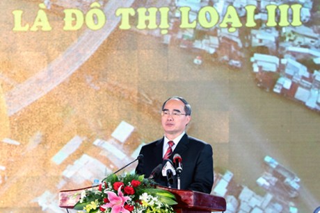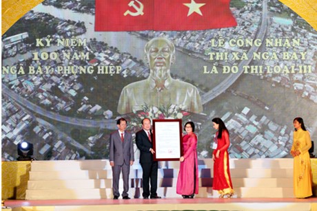 (VOVworld) – A ceremony was held in Hau Giang province on Friday to celebrate the recognition of Nga Bay town as a 3rd class urban area. President of the Vietnam Fatherland Front Nguyen Thien Nhan and Deputy Prime Minister Vu Van Ninh attended the event.