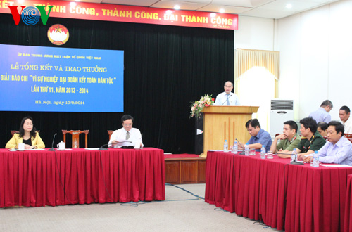 Radio Voice of Vietnam gained 9 awards, the highest number, with one first prize for a report highlighting farmers’ giving up farm land. Nguyen Thien Nhan, President of the Vietnam Fatherland Front, said that after 11 years the award for the cause of national unity had received a great response from reporters and news agencies.
