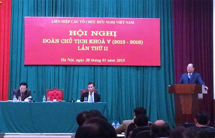 Chairman of the Vietnam Union of Friendship Organizations Vu Xuan Hong speaks at the meeting on January 20, 2015. Photo: qdnd.vn/Phuong Linh