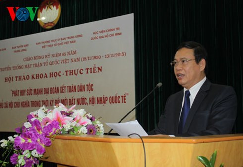(VOVworld) – A seminar on promoting national unity and socialist democracy in the renewal process was held in Hanoi on Monday to mark the 85th anniversary of the Vietnam Fatherland Front (VFF). VFF Vice President and Secretary General, Vu Trong Kim, said the Front’s role has been strengthened in current political and social life.