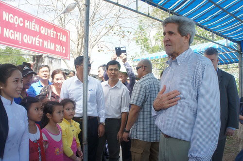 On Sunday, Kerry toured Ngoc Hien district in the Mekong Delta province of Ca Mau where he talked about response to climate change.
