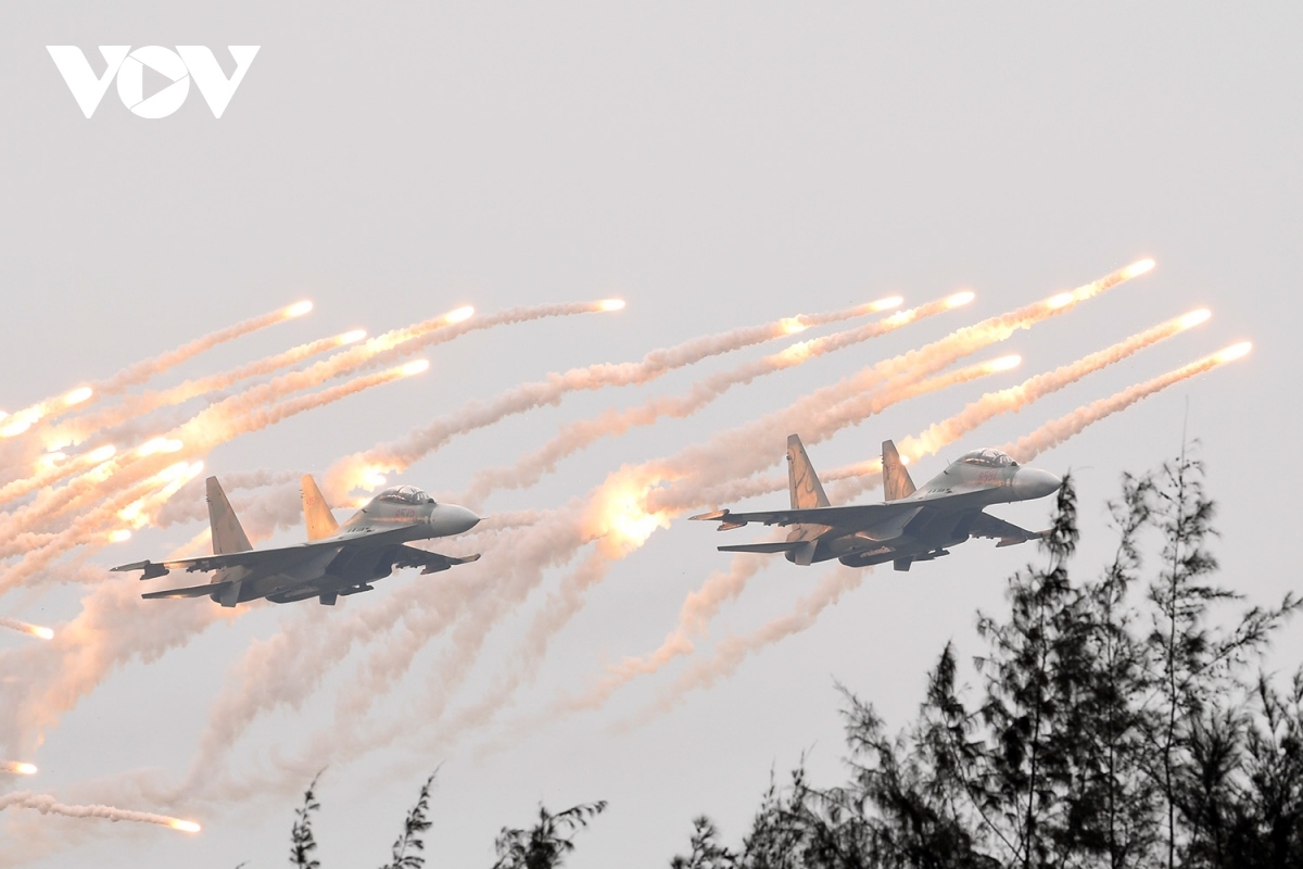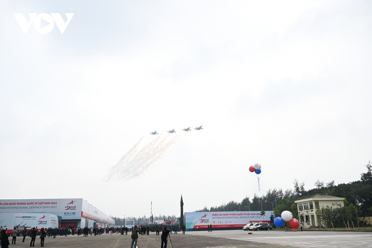 The Vietnam Air Force's Su-30MK2 fighters put on an impressive flying display at the opening ceremony of the Vietnam International Defense Expo 2022 in Hanoi on December 8. |