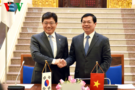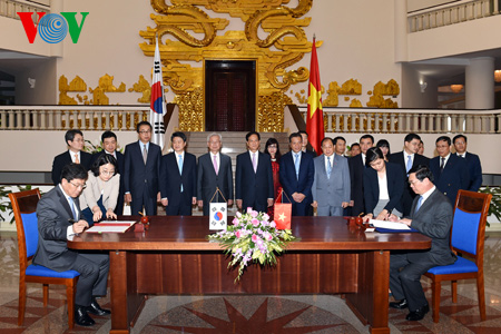 (VOVworld) – Vietnam and the Republic of Korea have signed a free trade agreement following two years of negotiations. The agreement was signed on Tuesday by Vietnam’s Minister of Industry and Trade Vu Huy Hoang and the Republic of Korea Minister of Industry and Energy Yoon Sang-jick in the presence of Vietnamese Prime Minister Nguyen Tan Dung and representatives of the two countries’ relevant ministries.