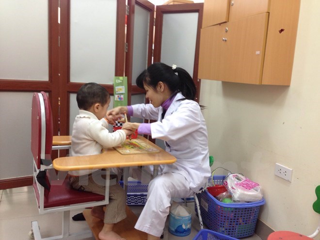 A medical worker from the National Hospital of Pediatrics tends to a child with autism (Photo: VNA) |
