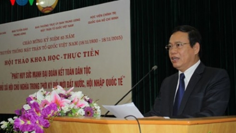 (VOVworld) – A seminar on promoting national unity and socialist democracy in the renewal process was held in Hanoi on Monday to mark the 85th anniversary of the Vietnam Fatherland Front (VFF). VFF Vice President and Secretary General, Vu Trong Kim, said the Front’s role has been strengthened in current political and social life.