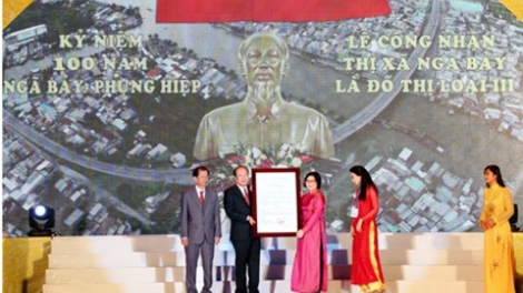 (VOVworld) – A ceremony was held in Hau Giang province on Friday to celebrate the recognition of Nga Bay town as a 3rd class urban area. President of the Vietnam Fatherland Front Nguyen Thien Nhan and Deputy Prime Minister Vu Van Ninh attended the event.