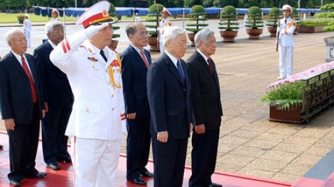 (VOVworld)_ A delegation of Vietnamese Party and State leaders led by Party leader Nguyen Phu Trong on September 2 paid tribute to President Ho Chi Minh at his mausoleum and offered incense at the Monument to Fallen Soldiers on the occasion of the 69th anniversary of Vietnam’s National Day.