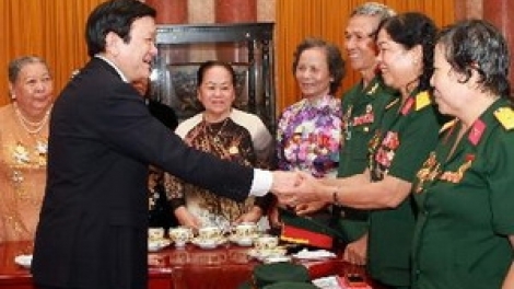 (VOVworld) – President Truong Tan Sang Tuesday received a delegation of veterans from across the country who had distinguished themselves in the field during the country’s revolutionary years. President Sang was very moved when listening to the war veterans’ stories and praised them for their contributions to the country’s past struggle for national independence and today’s construction.