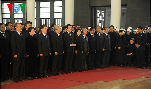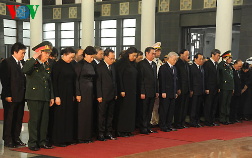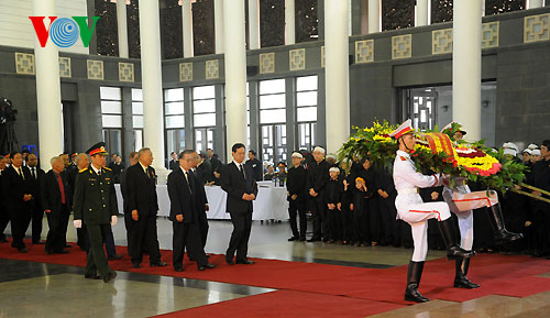(VOVworld) - The Central Committee of the Communist Party of Vietnam, the National Assembly, the President, the Government, and the Vietnam Fatherland Front organized a state funeral for General Vo Nguyen Giap at the National Funeral House in Tran Thanh Tong street in Hanoi. From 7:30 to 12:00, delegations from the Party Central Committee, the National Assembly, the President, the Government, the Vietnam Fatherland Front, the Military Central Party Committee, relatives of General Vo Nguyen Giap, party and state leaders, former senior party and state leaders and foreign leaders, the Hanoi party committee, the Hanoi people’s committee, the Hanoi fatherland Front, the Ministry of Defense, the Ministry of Public Security, international guests and the diplomatic corps, and Vietnamese war veterans pay tribute to General Giap.