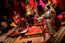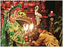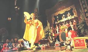 Thanks to the habit of worship that began in ancient times, temples were built in many localities. At each temple honoring a hero or a god, people gathered annually to recite derotional poems based on a folk phrasing of six-eight or five-seven meter. Over time, a genre was formed. Chầu văn is the combination of ritual customs of the Mother Goddess, worship habits, legends, and traditional music techniques. Many features of the Northern Delta region of Vietnam, from oratorio rituals in temples and pagodas to costumes and cuisine were incorporated into the genre. Sometimes, a Chau van singing contest between two villages is held to choose the best singer. In Chầu văn, a singer is called Cung văn. Accompaning him is a ‘hầu đồng’ or medium, who modestly calls himself a channel through which the gods may appear. The lyrics of a chầu văn song is usually a section of a legend which praises the merits of the gods. The characters worshiped can be a king, a hero, or just a farmer. Each performance can last up to 4 hours and worship 8 to 12 different characters. To start the show, performers purify the air, using a big fire to sweep away evil spirits. Professor Thao Giang talked to VOV about the customs of Chầu văn: