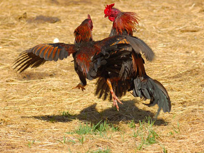 Before a cockfight begins, the owners agree on the terms among themselves. They compare the size, weight and fight records of their roosters. If one rooster has longer spurs, its rival is allowed to wear artificial spurs. After the discussion and agreement, the owners bring their birds into the ring. The cocks are kept in two separate halves of the ring until a signal is given to start the fight. Cocks usually attempt some trial feints to gauge their competitor's reactions before giving mortal thrashings: a double kick against the rival's body, a cut to the neck using spurs, or pecking out the rival's eye.