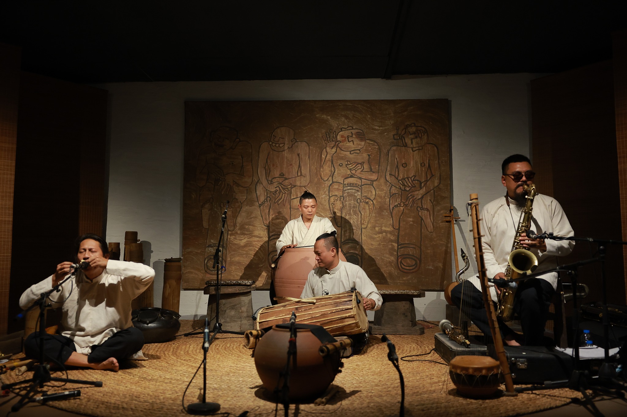 The "Dan Do" group collaborates with jazz artist Quyen Thien Dac (R) for a concert combining northwestern Vietnamese music and jazz.