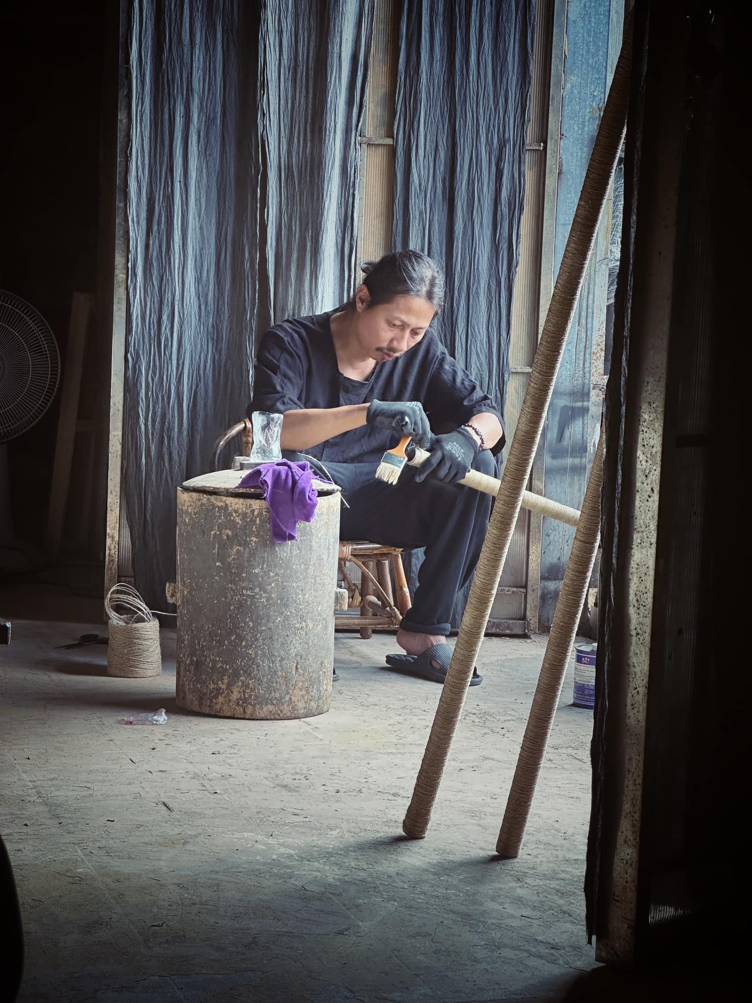 Nguyen Duc Minh is in the middle of making his original musical instrument.