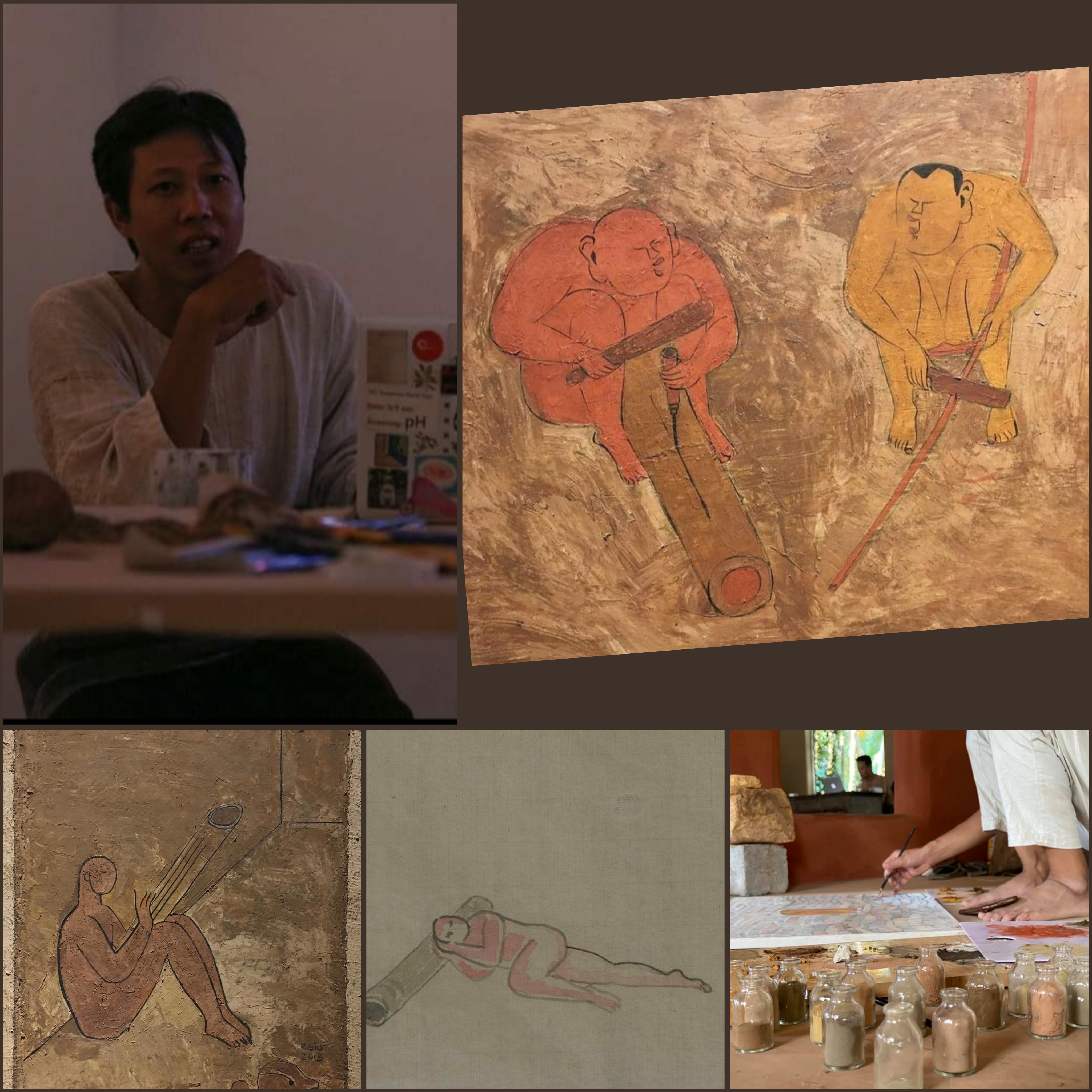 Phuong has gathered over 1,000 samples of soil from different parts of the country, primarily focusing on the rich red clay extracted from the banks of the Red River. After months of exploration and experimentation, he used some samples in his paintings. Soil, for him, is not just a medium; it holds historical significance. He likens his research on soil to musicians exploring bamboo as a material. Phuong’s paintings bring a tenderness, an amiable affection to the "Dan Do" Lab. Phuong documented the group's early activities on Dzo or poonah paper.