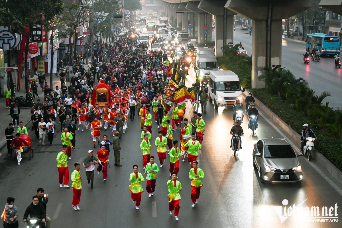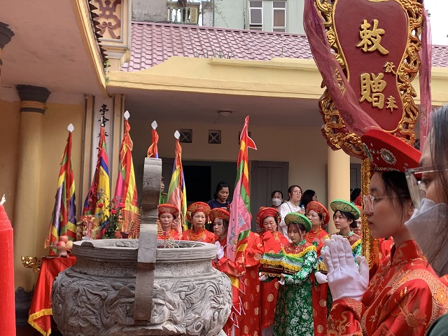 At 5:30 a.m a procession departs from Phung Khoang village, passes along Nguyen Trai road, and makes its way to Quan Nhan village. Other processions come from other Moc villages to Quan Nhan, the festival’s host. Along the route, the procession is welcomed and joined by residents of the villages and visitors, who form a large crowd behind the procession, led by a dragon dance troupe, followed by Buddhist representatives carrying flags and fans, and groups of boys playing drums and girls dancing. Each palanquin is carried by eight boys wearing red garments and black turbans. Another group carrying flags and worshipping objects follows.