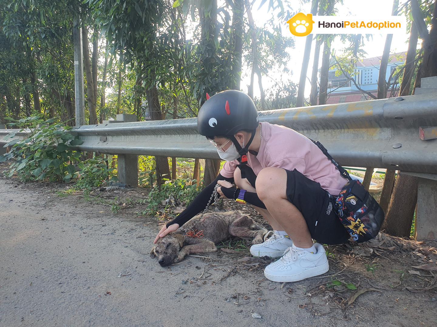 “When I received a phone call informing us that there was a puppy with scabies abandoned on the Thang Long highway, we immediately made our way there. The puppy was scared and exhausted, and kept barking at us. I gave him some food, which he finished in a few seconds. Then, we cuddled him to show that we wanted to help him. It took us 1 hour to calm him and get him to a vet clinic.”