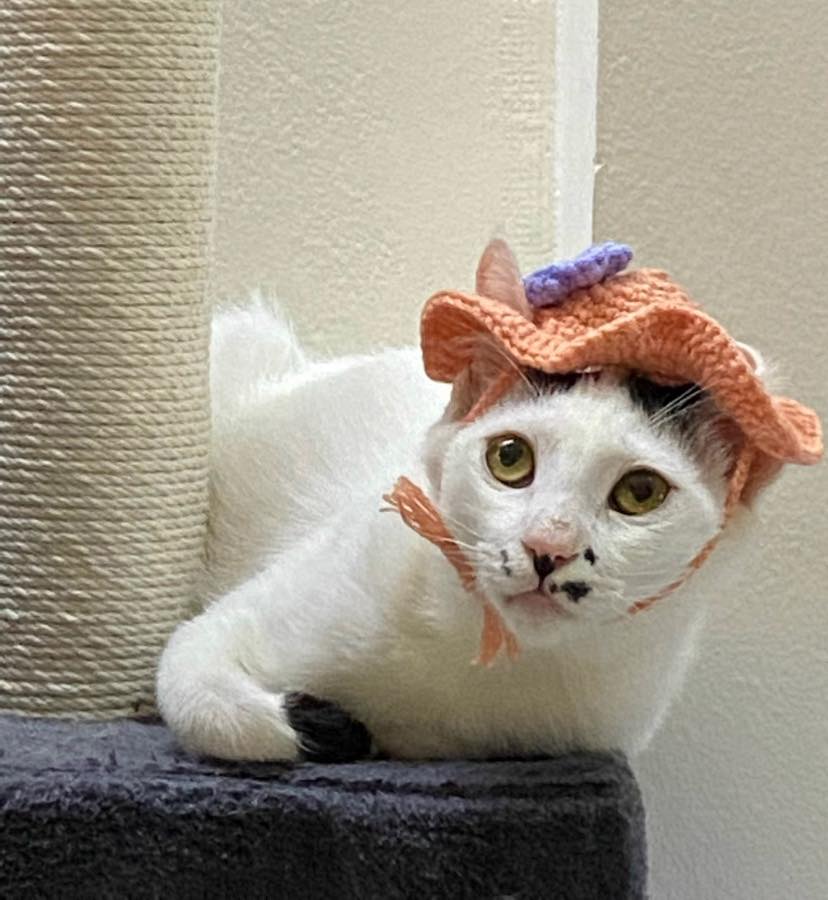 “We rescued Donna and her two kittens. At the time, Donna had severe scabies. One of her kittens died and the other was adopted. Donna is still here with us. That’s Pobby. Pobby was seen wandering on the street and eating rubbish. He was brought to the cat café. We’re still seeking an adopter for him.”