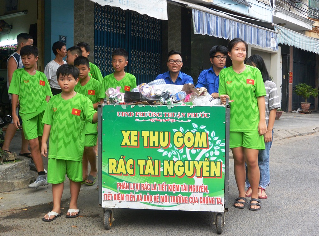 Binh Phuoc 1 residential area, Hai Chau district, Da Nang city has recently been frequented by children in green shirts pushing trolleys around the streets and small alleys to collect plastic bottles and recyclable waste. The waste will then be classified before being sold to raise funds to help disadvantaged families and sick people in the area. One of the children, 8-year-old Le Hoang Anh said: “We feel a little bit tired but we’re so happy. We want to make the area we’re living in cleaner, and so does everyone else.”