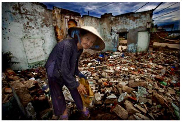 "I told my friends a few years ago that I missed the place and wanted to visit it for old times’ sake. As I stood before a vast ruin of what used to be our hideout, I saw a skinny but beautiful old woman. She was picking beer cans and plastic from the rubble. I quietly followed her for a while, and when she got to where I wanted her to be, I greeted her loud and clear. She looked up and I took the shot."