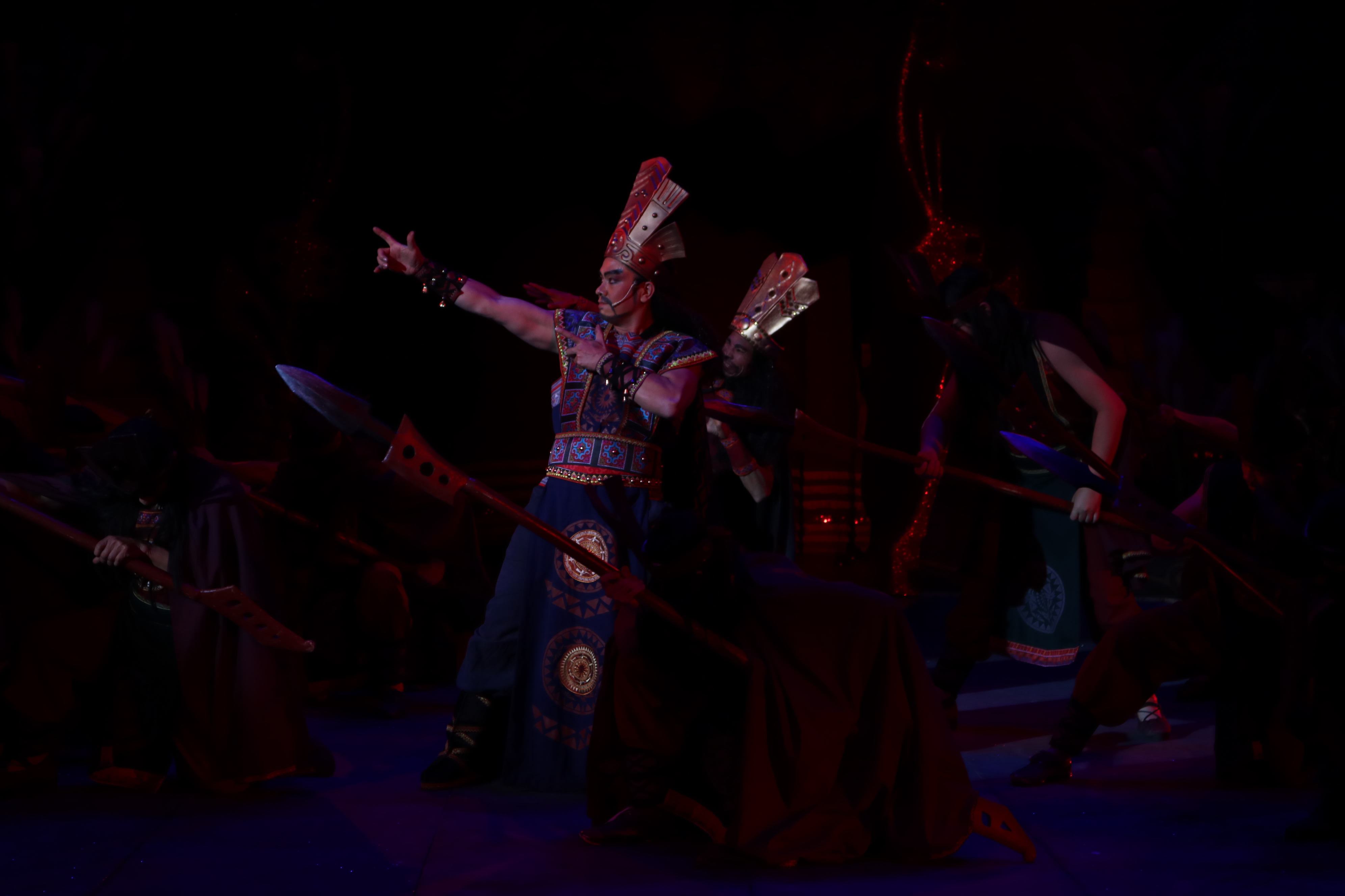 The mandarin decides to return to Phong Chau to beg for her back. On the way, he is entered by an evil spirit, which wants to destroy all humans around it. From that moment on, the mandarin plots to steal Tien Dung back and overthrow the Hung King – Tien Dung’s father and a legendary founder of the Vietnamese nation. This scene is supported by four aerobatic artists, dressing up as black bats, who perform and lift the mandarin up high.