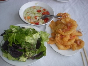 Shrimp cakes are served at the eponymous restaurant Banh Tom Ho Tay (West Lake Shrimp Cake) and many smaller restaurants near Tay Ho temple. Being drawn by the smell of fried oil and shrimps to enjoy a plate of the delicacy next to windy West Lake creates an in indelible memory.