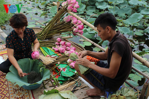 Ms Nguyen Thi Tuyet, who has made lotus tea for generations, describes on how to scent the tea in the traditional way: “Anthers are separated from the newly-collected flowers and then mixed with dried green tea. After two days, remove the anthers from the tea before drying the tea again in low heat. Add more anthers and continue scenting the tea. The process is repeated three times or more. It takes 100 to 120 lotus flowers to make just one gram of tea.”