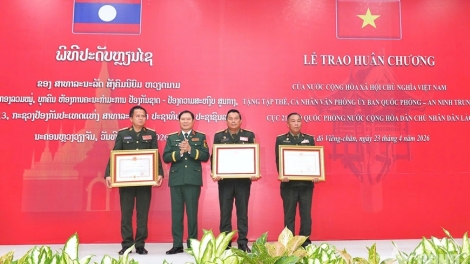 [VOVWORLD] - ในกรอบการเยือนลาวอย่างเป็นทางการ เช้าวันที่ 23 เมษายน พลเอก เหงียนเตินเกือง รัฐมนตรีช่วยว่าการกระทรวงกลาโหม ได้เข้าร่วมพิธีมอบเหรียญอิสริยาภรณ์เอกราชและเหรียญอิสริยาภรณ์มิตรภาพของรัฐเวียดนามให้แก่ 5 หมู่คณะและ 39 บุคคลสังกัดกระทรวงป้องกันความสงบลาว