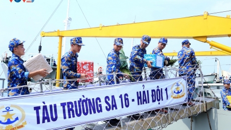 นำของขวัญตรุษเต๊ตให้แก่เจ้าหน้าที่ทหารที่แท่นตรวจการทางทะเล DK 1