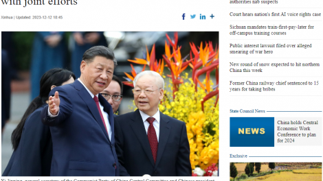 (VOVWORLD) -การเยือนเวียดนามอย่างเป็นทางการของนาย สีจิ้นผิง เลขาธิการใหญ่พรรคและประธานประเทศจีนได้กลายเป็นข่าวสำคัญของสื่อมวลชนจีนช่วงใน 2 วันที่ผ่านมา